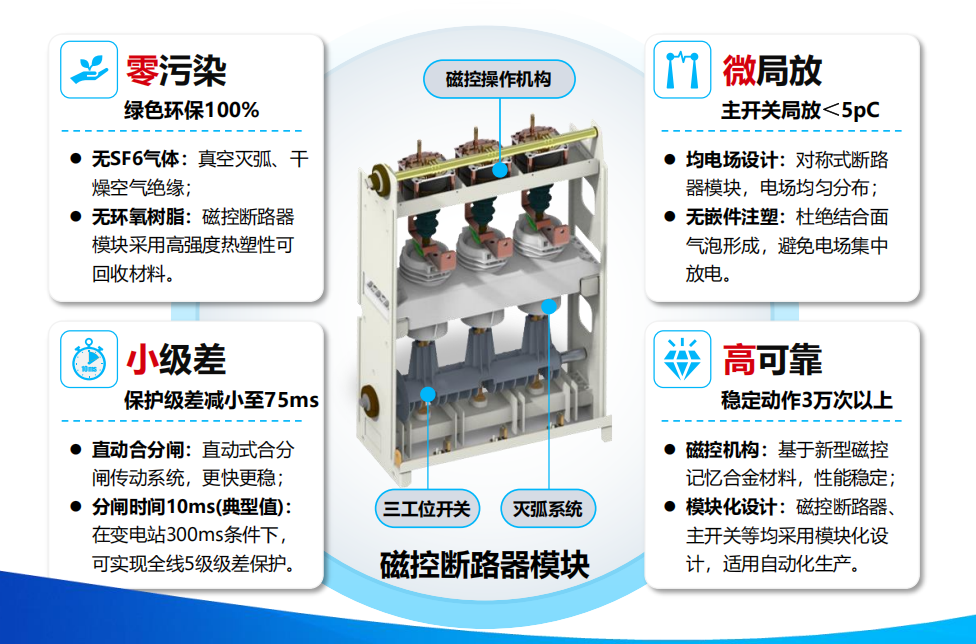 磁控核心以磁控断路器模块为核心,打造全新绿色环保型环网柜设备。